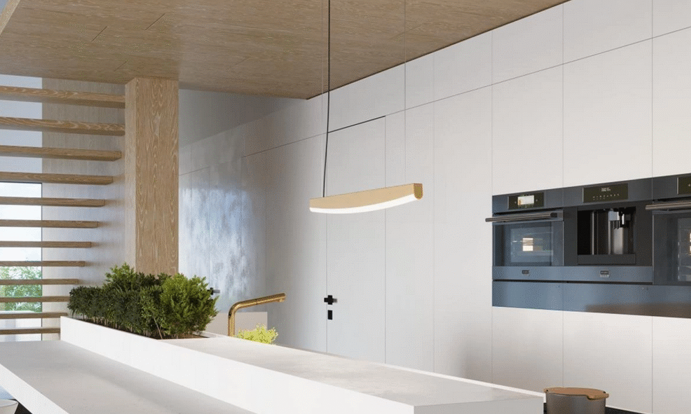 W układzie L oś optyczna często jest przesunięta. Najpewniejszym sposobem jest trzymanie rastra wzdłuż dłuższego boku wyspy i osadzenie kompozycji w relacji do „dłuższej nogi” litery L – lampa staje się wizualnym łącznikiem z salonem. W układzie U trzymaj lampy równolegle do części środkowej i kontroluj odległość od pionu wysokiej zabudowy, by nie tworzyć ostrych refleksów w gładkich frontach.
